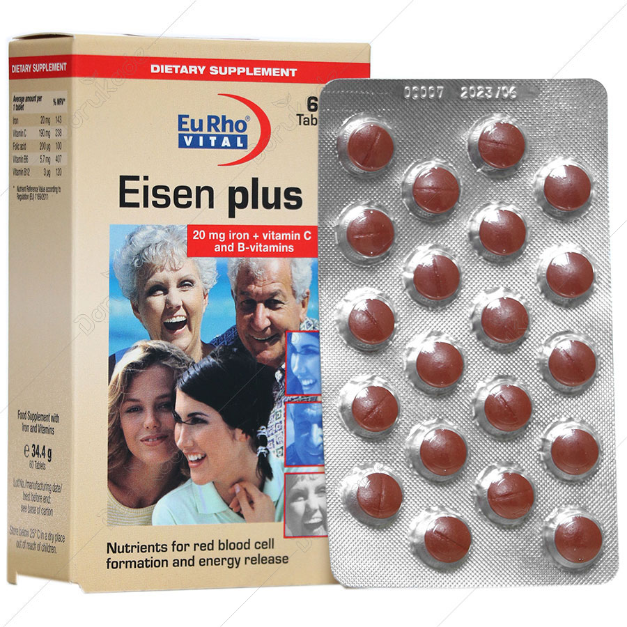 - آیزن پلاس حاوی ویتامین B9، ویتامین B6 و ویتامین B12 برای کمک به ساخت گلبول های قرمز