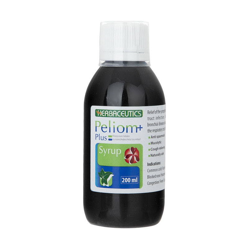 • شربت پلیوم پلاس، حاوی عصاره ریشه پلارگونیوم سیدوئیدز و عصاره خشک برگ پیچک (هدرا هلیکس)