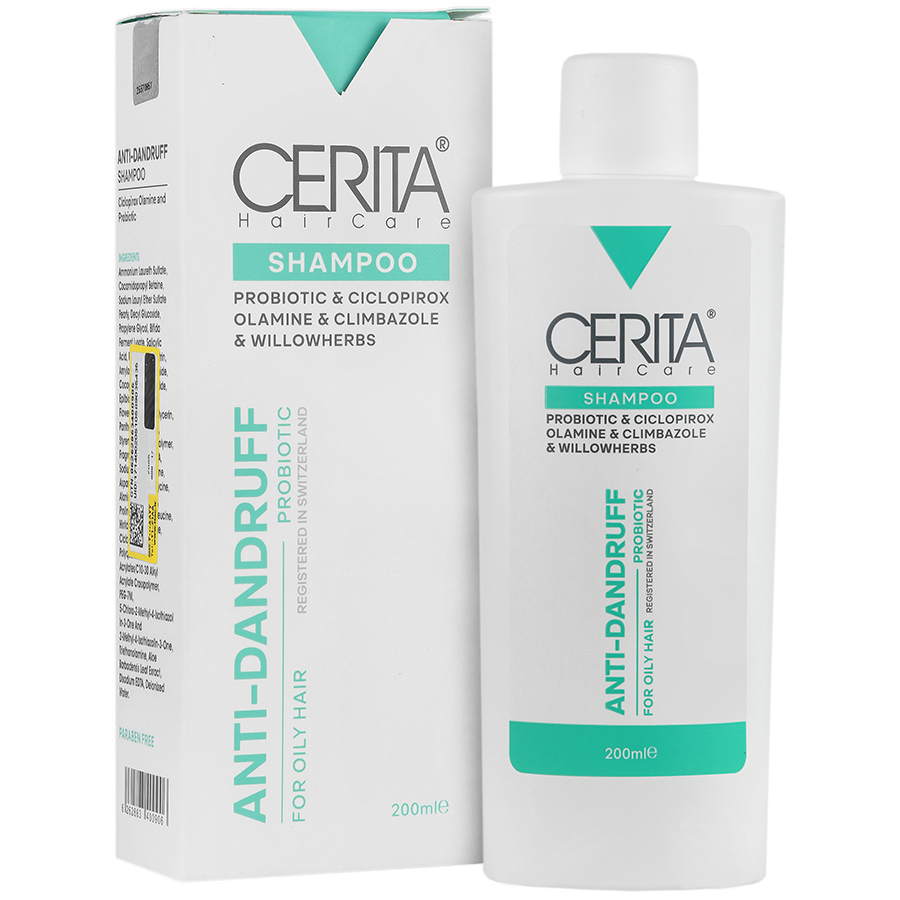 - شامپو ضد شوره سریتا برای موهای چرب، حاوی ترکیبات پروبیوتیک و بازسازی و احیای پوست سر