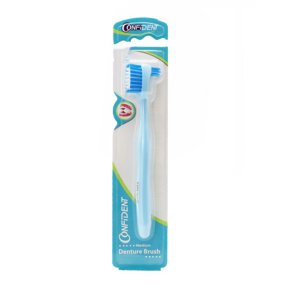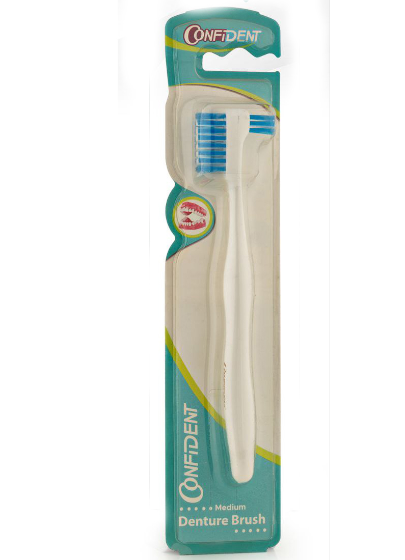 - مسواک دندان مصنوعی کانفیدنت با برس متوسط، دارای سر کوچک مسواک مناسب برای پاکسازی محل اتصال لثه و دندان مصنوعی